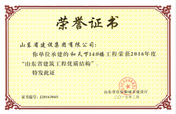 萬博·北京灣C區2#、3#樓評為2016年度泰安市優質結構杯