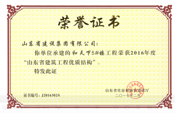 和天下14#樓被評為2016年度萊蕪市優質結構工程