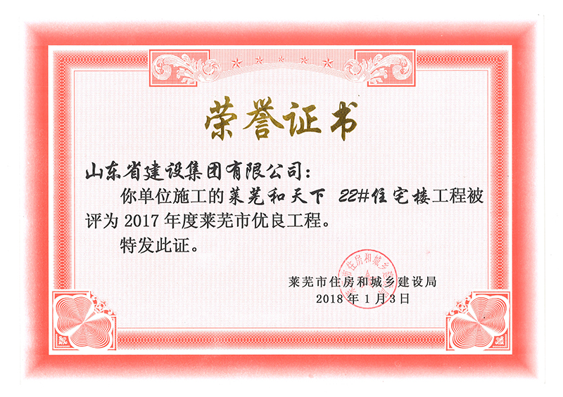 萊蕪和天下22#樓被評(píng)為2017年度萊蕪市優(yōu)良工程