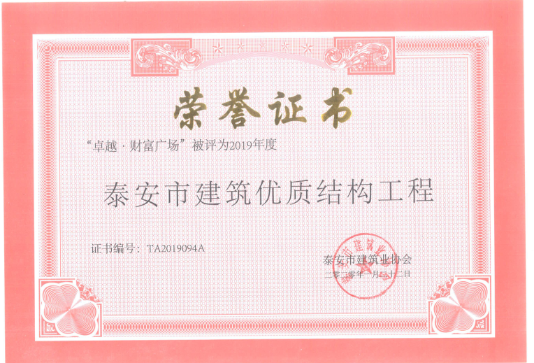 卓越財富廣場被評為2019年度泰安市建筑優質結構工程