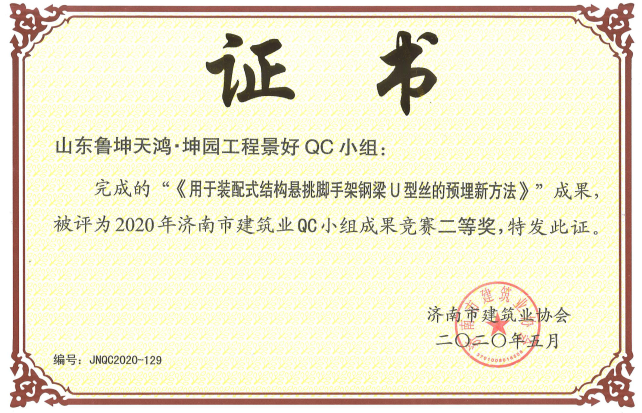 魯坤天鴻·坤園工程景好QC小組獲濟(jì)南市建筑業(yè)QC小組成果二等獎