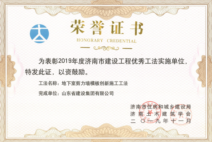地下室剪力墻模板創新施工工法被評為優秀工法
