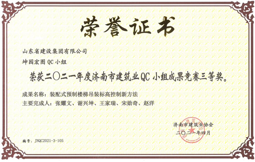 坤園宏圖QC獲2021年度濟(jì)南市建筑業(yè)QC小組成果競賽三等獎(jiǎng)