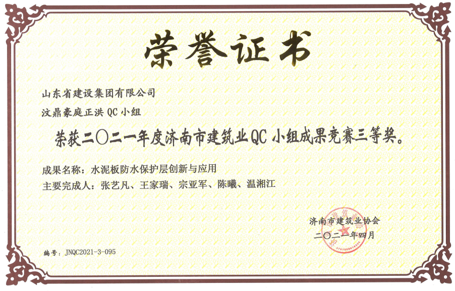 汶鼎豪庭正洪QC獲2021年度濟南市建筑業(yè)QC小組三等獎